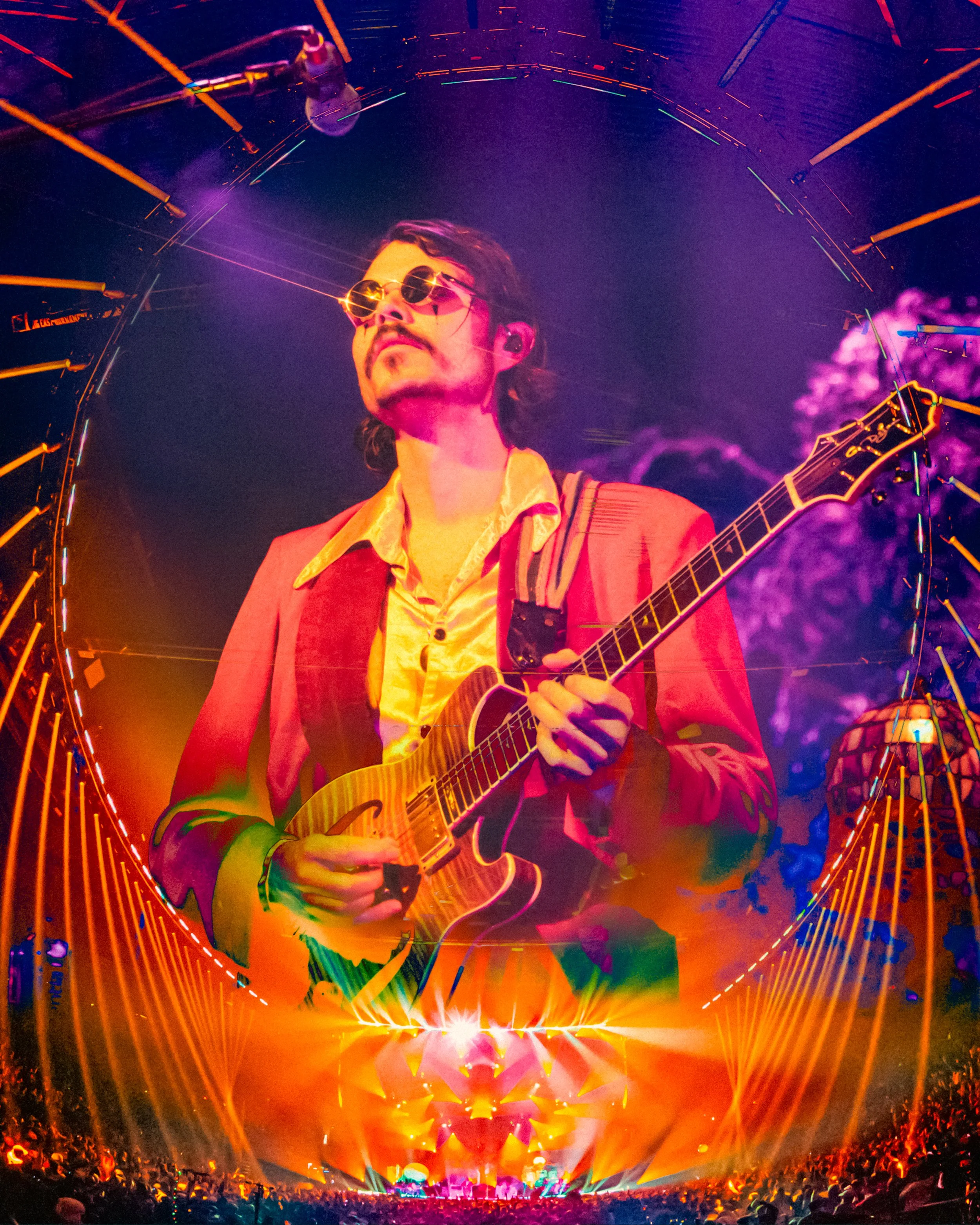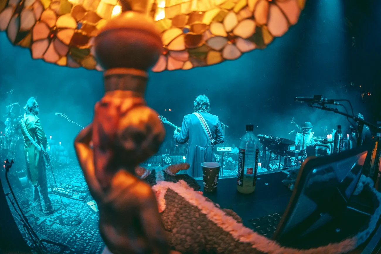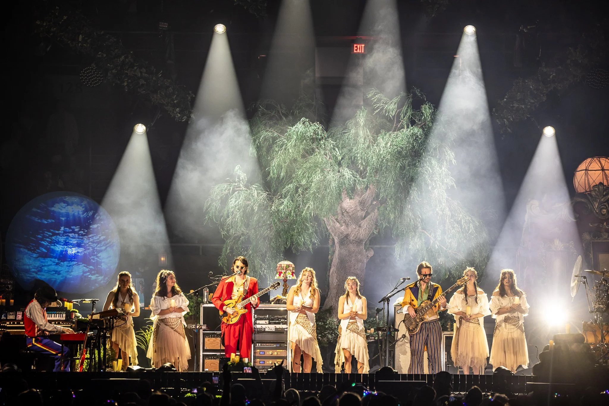The experience was anchored in a conceptual "North Star" narrative set in a dark, eternal carnival from 1734. By blending Andrew Goedde’s lighting with physical theater, Bolognino and META integrated elements like the "Eye of the Deep"—a massive, projection-mapped sphere—and a "Curio Cabinet" that transformed the arena floor into a participatory installation. This narrative approach reached its peak in moments of stark, intimate staging, such as a single lamp being extinguished in a darkened arena to conclude Night One, successfully shrinking the massive room into a private, human connection, leaving Rick Mitarotondo solo on stage, with a giant full moon behind him, and not a dry eye in the arena. The two shows were designed as a palindrome, as night two began where the first night left up, starting with Rick. A group of magical and mysterious female sirens emerged, flanking Rick and the band in a stunning choral rendition of Goose’s melodic anthem “Give it Time.” The show grew wilder and wilder, climaxing with an electronic DJ dance party led by bass player Trevor Weekz’s “DJ Marb Menthols” Fun House themed explosion of character performance, lighting, and music.