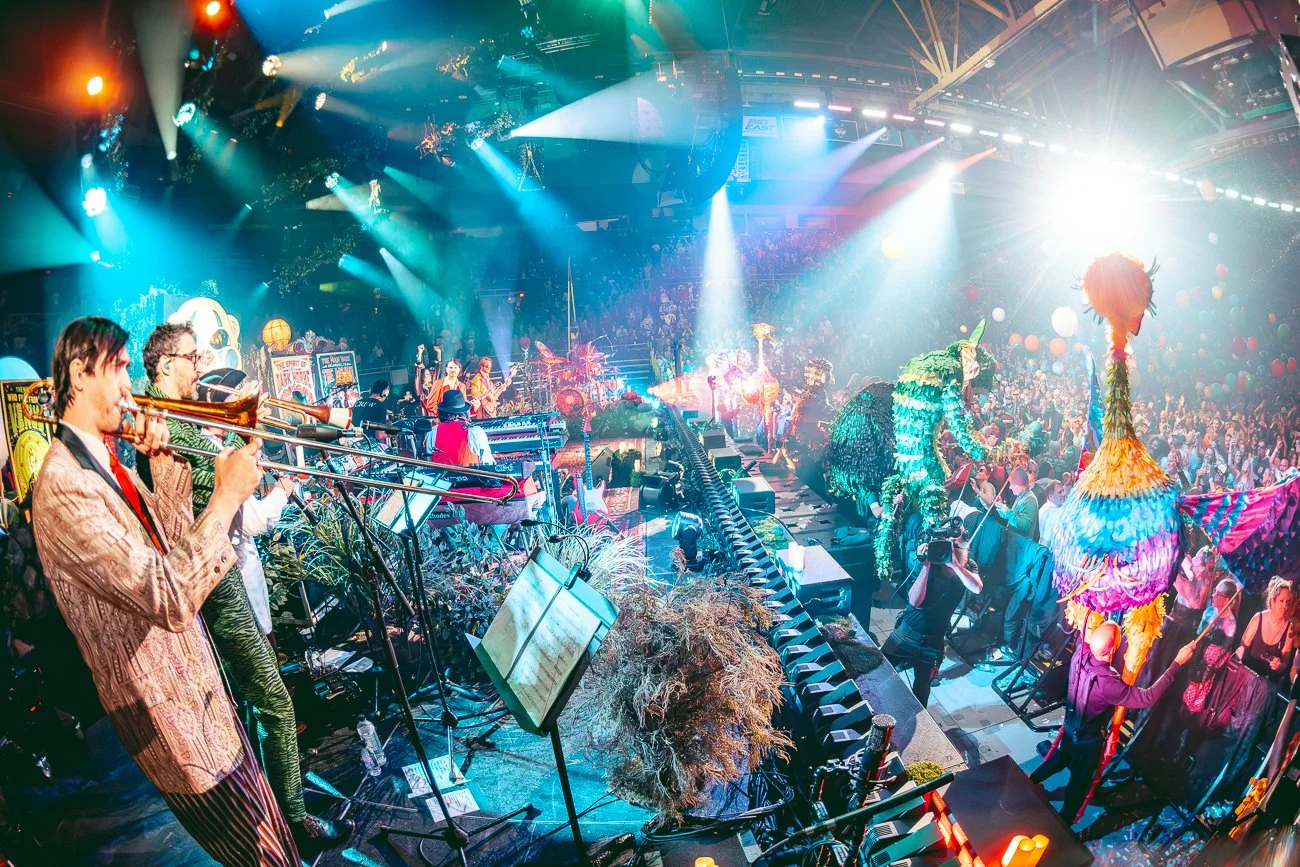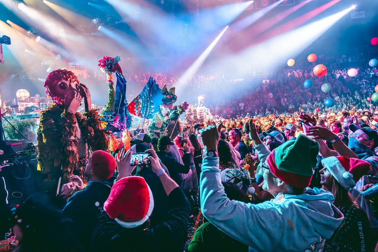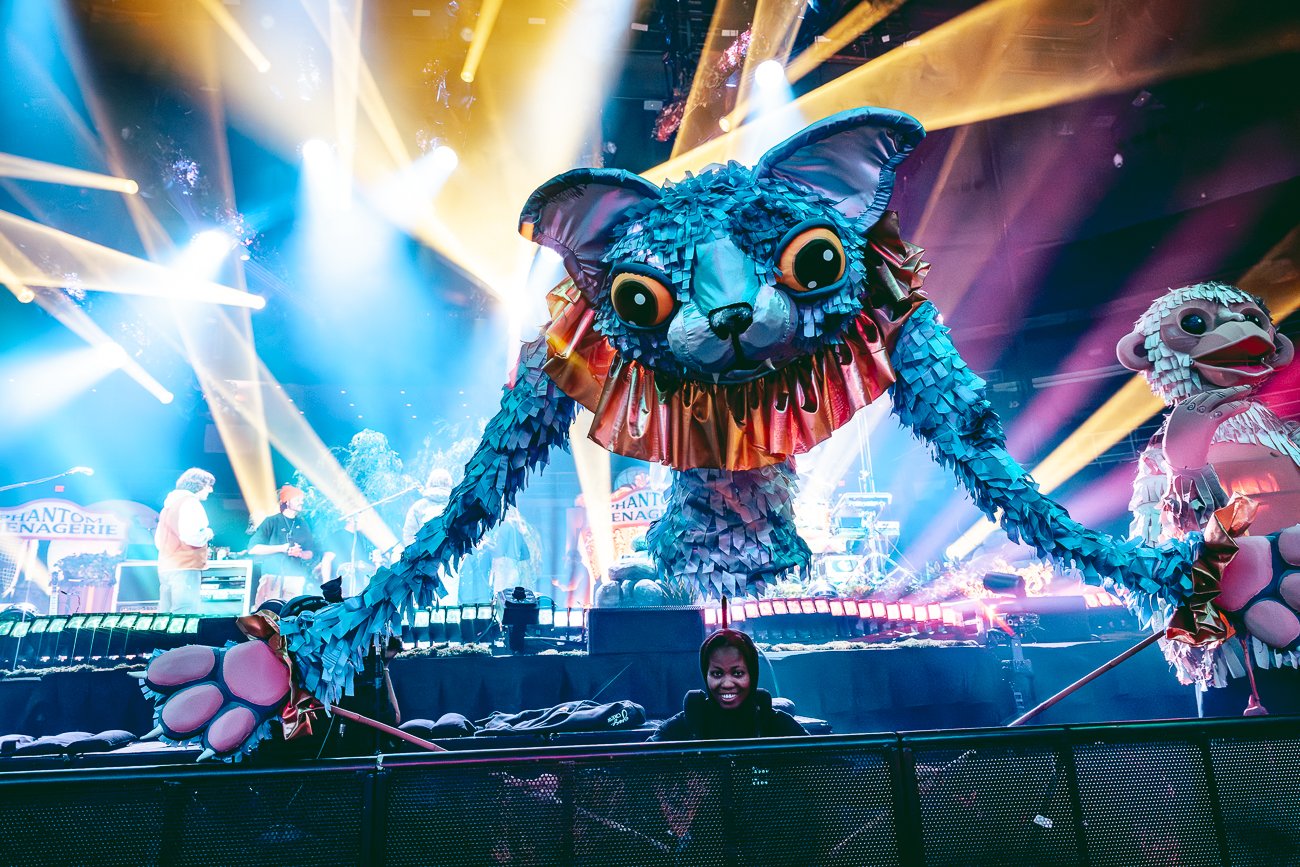 Goose, evolving the annual tradition into a sprawling multi-sensory narrative titled "Show Upon Time". Moving beyond traditional production, the creative team, led by Goose’s Creative Director Will Thresher, META’s Justin Bolognino as Experience Director, and Rüts as Creative Producer, treated Providence’s Amica Mutual Pavilion as a living canvas for world-building, weaving the band’s improvisational language into signature "sonic immersions". The result was a theatrical environment where music didn't just play to the audience—it lived among them through a "Phantom Menagerie" of oversized animal puppets and surrealist performers.